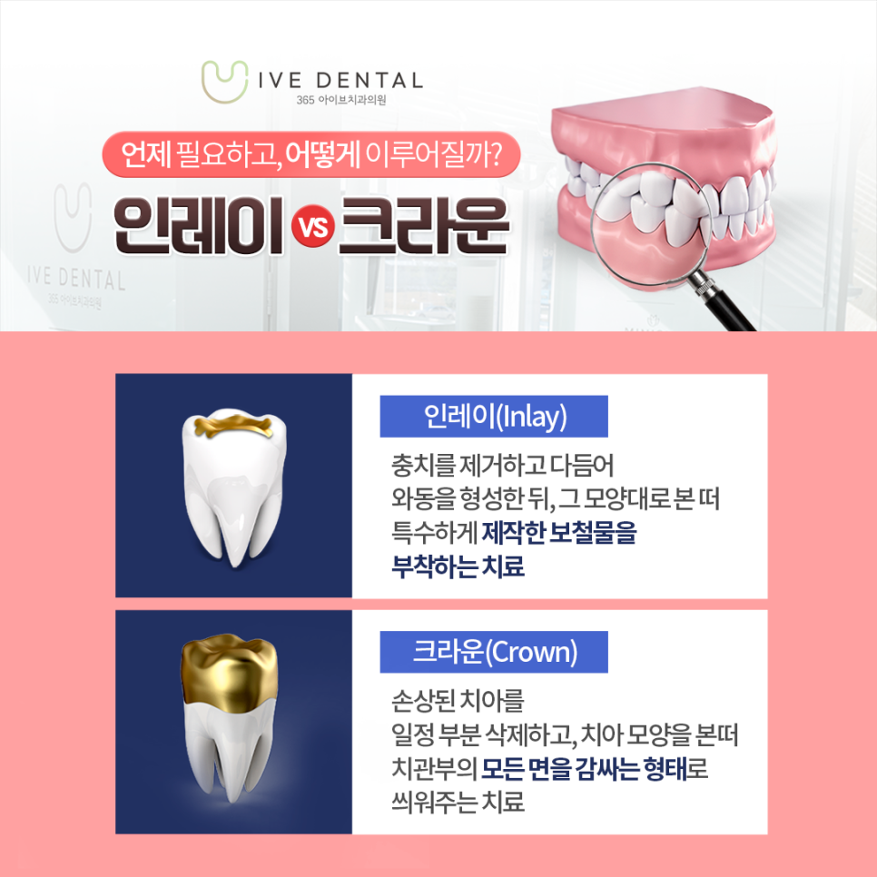 인레이와 크라운의 경우에는 레진처럼 사람 손으로 하는 것이 아닌 기공 장비에서 제작이 되어 나오기 때문에