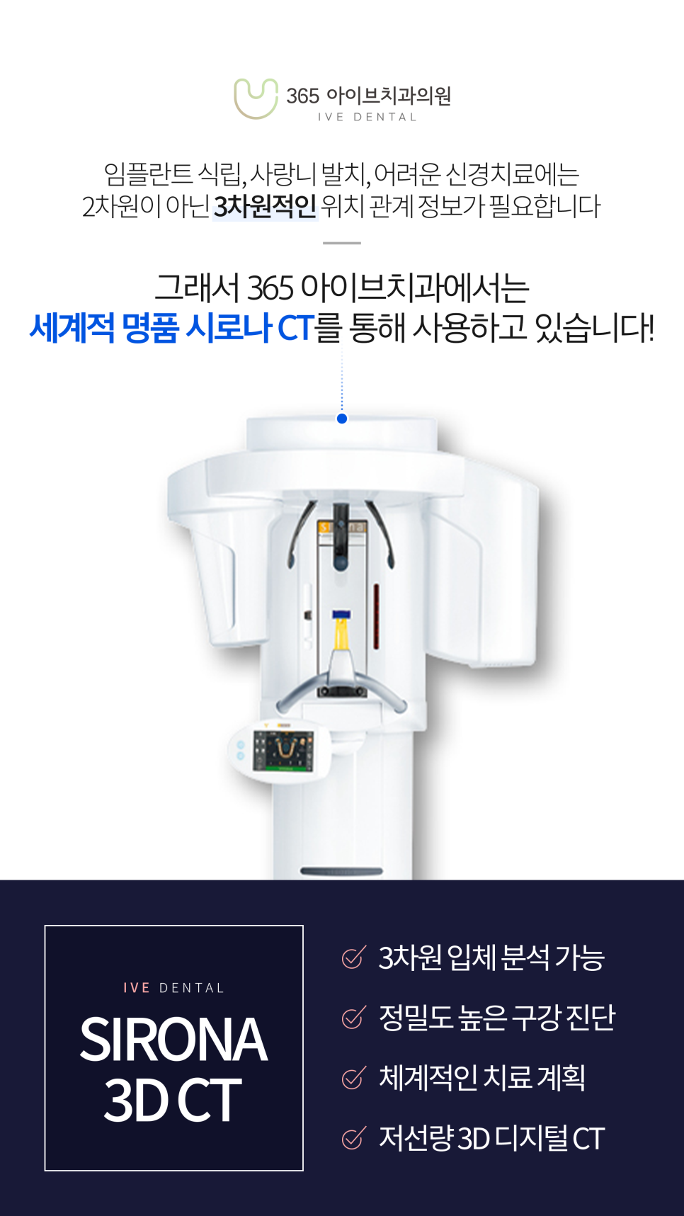 먼저 정확한 진단을 위해 저희 치과에서는 1억이 넘는 세계 최고의 치과용 CT인 시로 나사의