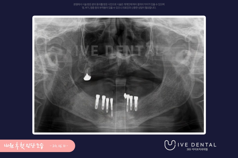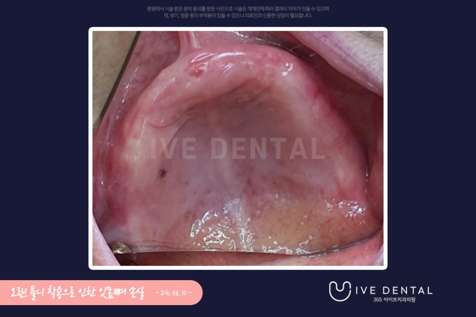 10년 전 임플란트 시술을 하시고 틀니를 사용 중인 분으로 잇몸 통증이 지속해서 발생하여