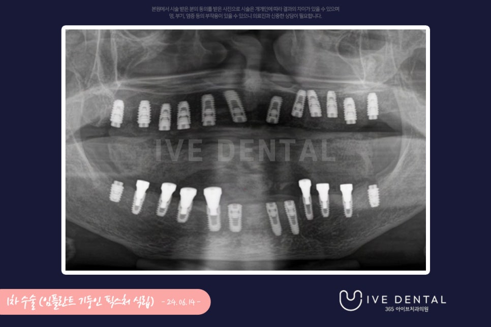 환자분의 잇몸 상태가 좋지 않으셔서 뼈이식, 상악동 거상술 등 추가 수술도 같이 시행되었고