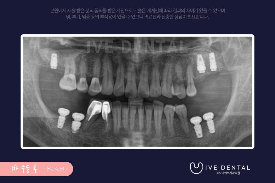 환자분의 잇몸 상태가 너무 좋지 않아 상악동거상술, 뼈이식 등 추가 수술을 같이 시행하였고요.