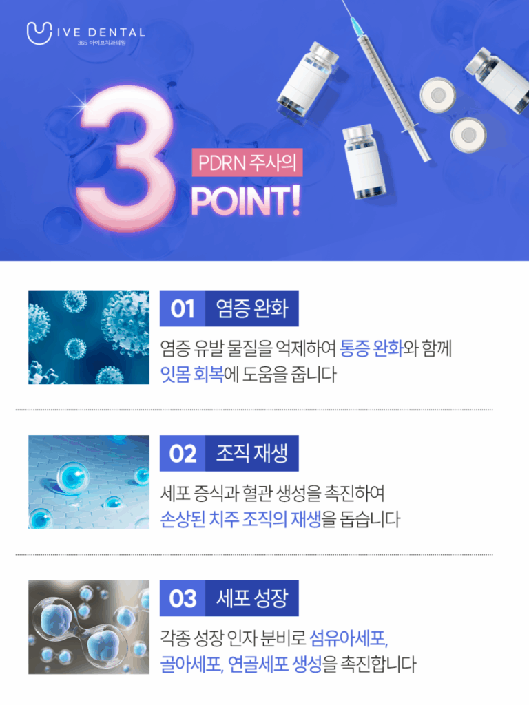 이 PDRN 주사는 연어에서 추출한 DNA로 만든 성분으로 뛰어난 재생 효과를 지니고 있어 발치로 인한 상처 치유에 큰 도움이 됩니다!