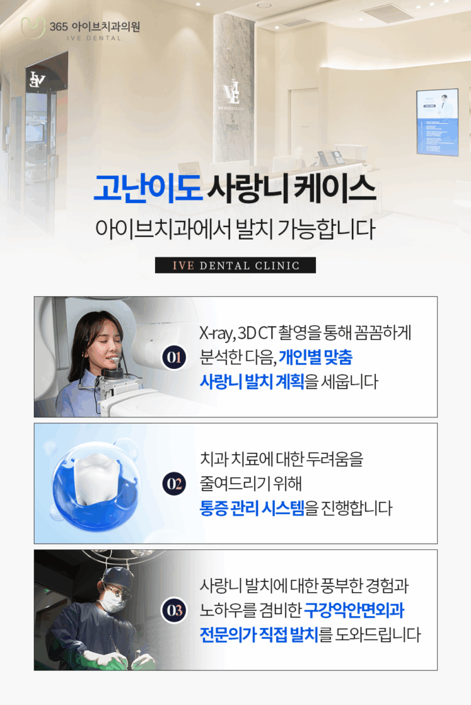아이브치과에 사랑니 발치를 위해 내원하신다면 한분 한분 세심하게, 통증이나 후유증이 없도록 빠르고 정확하게 발치를 해드릴 것을 약속드리겠습니다.